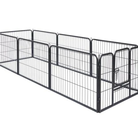 Suositellaan keskikokoisille pennuille ja keskikokoisille aikuisille koirille. Sopii ulko- sekä sisätiloihin. Helppo asentaa, ei tarvita työkaluja. Vie koottuna vähän tilaa. 8 toisiinsa kiinnitettävää paneelia, yhden paneelin koko 61×91 cm. Kaikki osat tallella.