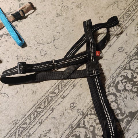Basic merkin vaaleanpunaiset y valjaat. Mustat lukot ja yksityiskohdat ja ompele osittain heijastavaa. Sopii isolle koiralle. Säätö mahdollisuutta oli omalle koiralle edelleen vaikka kokoa jo 60kg ja 77cm korkeutta. Sopivat lenkkeilyyn. Kestävää materiaalia.