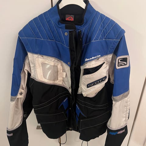 Scott ajotakki musta. Edessä on useita taskuja ja vetoketjukiinnitys. Takki soveltuu moottoripyörä- tai muuhun ajokäyttöön. Materiaali vaikuttaa olevan tekstiiliä, jossa on vahvistettuja kohtia kulutuksen kestävyyden parantamiseksi. Vettä hylkäävät taskut. Hihat vetoketjulla irrotettavat, voi myös käyttää liivina.
