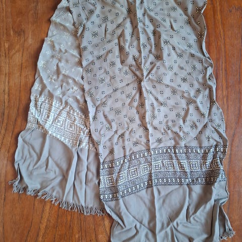 Vintage kaulahuivi, jossa tummansinisellä pohjalla vaaleita geometrisiä kuvioita.