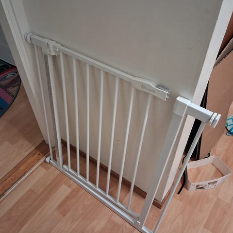 Puinen, pystypinnainen portti, joka soveltuu esimerkiksi portaiden tai oviaukon sulkemiseen. Portissa on seinään kiinnitettävät puukiinnikkeet ja lovettu ohjainosa, joiden avulla portti voidaan avata ja sulkea. Materiaali on käsittelemättömän tai kevyesti käsitellyn puun näköinen. Leveys n. 94.5cm mukaan lukien seinään kiinnitettävät osat, korkeus 70cm, Itsetehty levennys, puinen osa, saa mukaan halutessaan n. 7cm.
