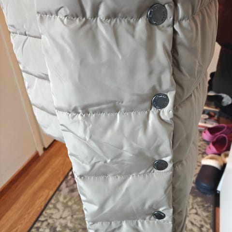 Puolipitkä, tikattu takki, koko 46/48, irrotettava huppu irrotettavalla tekoturkiksella ja nyörillä, kaksisuuntainen vetoketju, taitettavat hihansuut heijastin nauhalla ja etutaskut vetoketjulla, sisätasku tarralla, kainalo-kainalo 65 cm ja olka-helma 84 cm, hupussa sauma auki, ollut varmasti ihan alusta asti. Näkyy kuvassa. Ei näy käytössä. Muutaman kerran käytetty ja yhden kerran pesty. Itselle liian lämmin takki, muuten aivan ihana.
