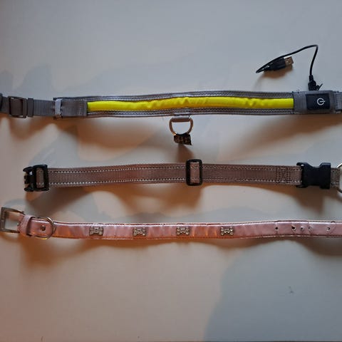 Kolme pientä kankaasta tehtyä pantaa ja kaksi hihnaa. Toinen pidempi. Pidempi on sininen kapea grippi hihna. Toinen kankainen ja siinä heijastinta. Yhteisenä satsina möisin nämä mielellään.