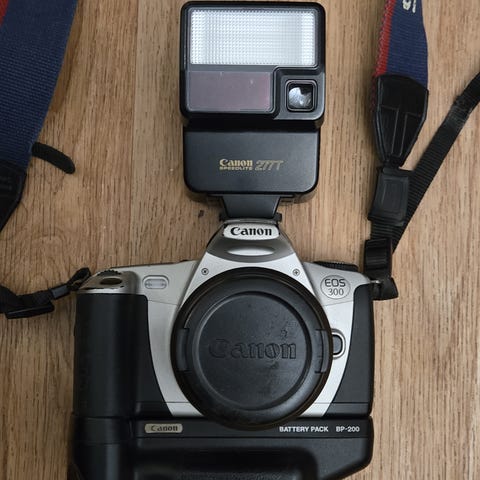 Canon EOS 300 filmikamera, jossa vaihdettava objektiivi. Kamerassa on etupuolella Canon Zoom Lens EF 28–80 mm 1:3.5–5.6 -objektiivi, jossa on käsisäätöinen zoom- ja tarkennusrengas. Rungossa on sisäänrakennettu salama, päällä ohjelmavalitsin eri kuvaustiloille sekä LCD-näyttö asetusten tarkasteluun. Kamera käyttää 35 mm filmiä ja EF-kiinnitteisiä objektiiveja. Sopii yleiskuvaukseen, kuten maisema-, muoto- ja arkipäivän kuvaukseen filmille.
