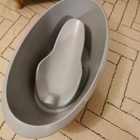 Vauvan kylpyamme ja erillinen kylpytuki. Lapsen voi laskea lapsen tuen päälle, jolloin ei tarvitse kannatella käsivarsilla koko kylpyhetken ajan.