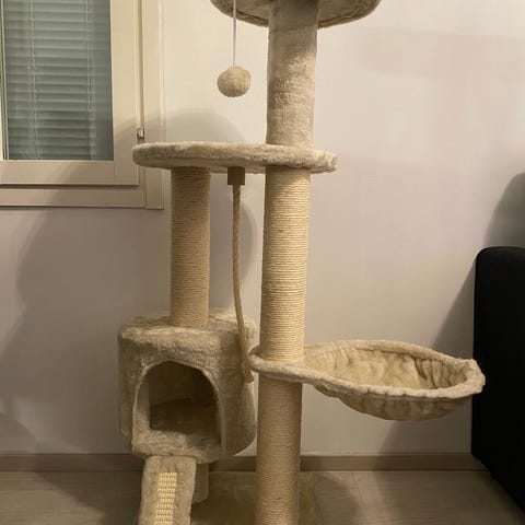Iso,monitasoinen raapimispuu kissalle. Vaalea, pehmeäpintainen verhoilu ja useita tasoja kiipeilyyn ja lepoon. Yläosassa on koppi kahdella aukolla sekä roikkuva pallo leikkiä varten. Narutolpat on edelleen tosi hyvässä kunnossa koska minun kissa ei juuri tähän terottele kynsiään. Ainut mitä minun kissa on käyttänyt,on tuo ylin osa jossa tykkäsi nukkua.