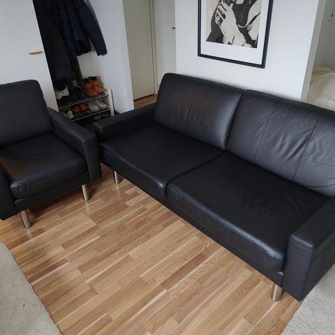 Myyntiin kuvien mukainen musta nahkainen sohvaryhmä, johon kuuluu: