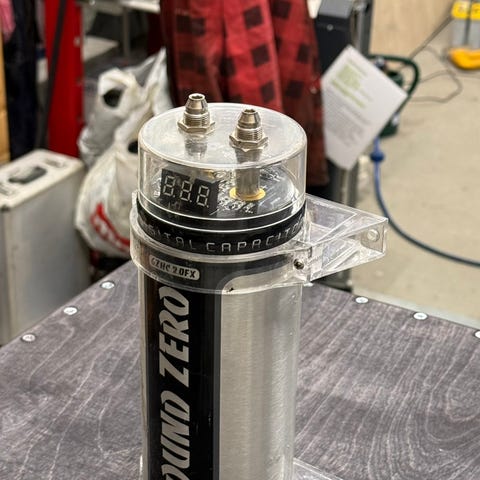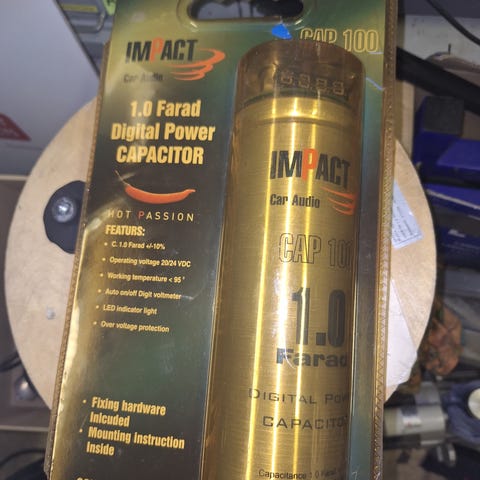 Hyväkuntoinen vähä käytöllä ollut jännitenäytöllinen 2 faradin kondensaattori.