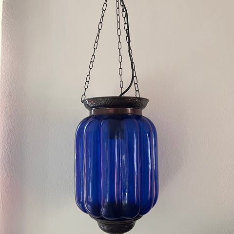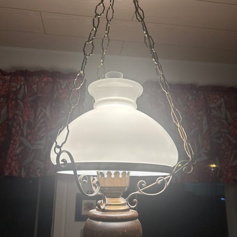 Lasinen kattolamppu, öljylampun tyylinen valaisin. Yläosa on valkoista opaalilasia ja alaosassa on valkoinen lasikupu (lasitteessa pientä sanomista) ruskeasävyisellä kukkakoristeella. Metalliosat ovat patinoitunutta metallia. Sopii sisätilojen yleisvalaistukseen tai tunnelmavaloksi.