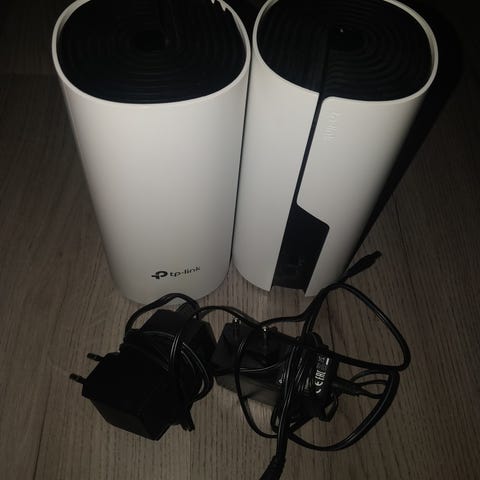 TP-Link Deco E4 AC1200 Mesh-wifi -järjestelmä 3-pack. Tarkoitettu kodin tai pienen toimiston langattoman verkon laajentamiseen ja yhdenmukaistamiseen. Jokaisessa yksikössä virtaliitäntä ja verkkoliitännät. Mukana virtalähteet.
