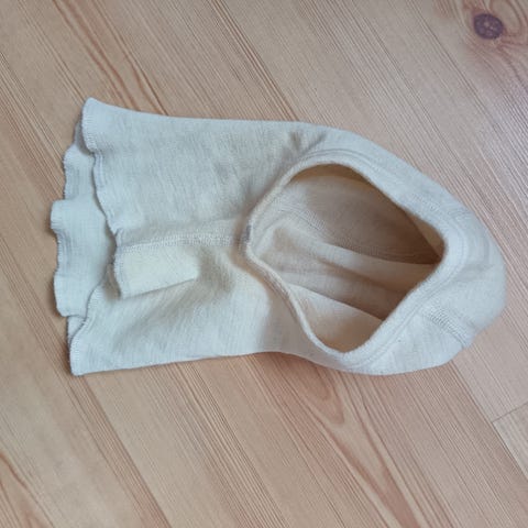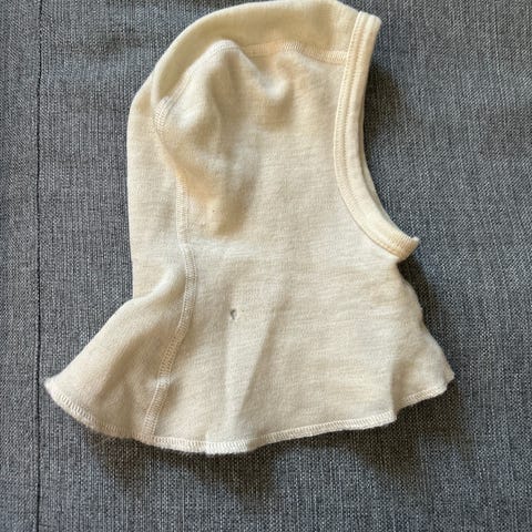 Ruskovillan merinovillainen kypärämyssy, väirinä luonnonvalkoinen. Ehjä ja siisti käytetty kunto.