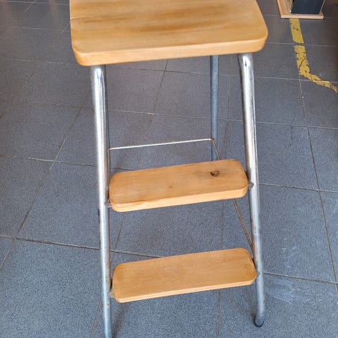 Vanha porrasjakkara. Alin askelma hieman haljennut ja liikkuu. Muuten tukeva. Käytönjälkiä. Koiratalous.