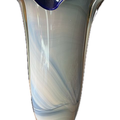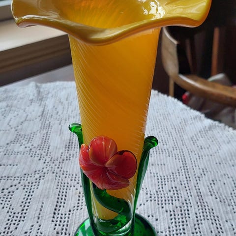 Murano lasinen koriste-esine kukka-aiheisella muotoilulla. Esineessä on kirkas, aaltoilevareunainen lasiosa, jonka keskellä on vihreä lasinen yksityiskohta. Koristeessa on oranssi-keltainen kukka ja vihreät lehdet, kaikki lasia. Sopii esimerkiksi pöytäkoristeeksi tai hyllylle sisustuselementiksi.