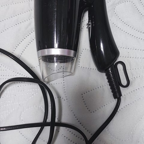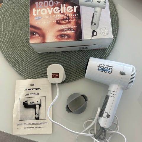 Braun Cosmo 1000 matkahiustenkuivaaja. Mitat: leveys 11 cm, korkeus 16 cm.
