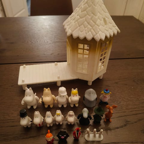 Muumitalo kalusteilla, talviuimahuone ja 20 muumihahmoa.