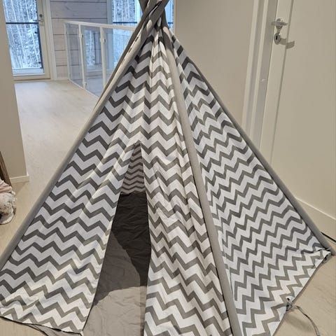 Vaaleansininen lasten leikkiteltta/tiipii. Oviaukkoa voi sulkea tarroilla tai sitoa naruilla sivuille. Takana ikkuna-aukko. Kolmiokuvioita kankaassa. Korkeus n.160cm. Ei kulumia. Nouto Savolanniemi.