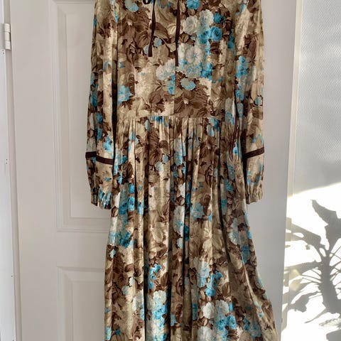 Myydään kaunis ja elegantti vintagemekko, jossa on näyttävä ja yksityiskohtainen kuosi kullan, punaisen ja vihreän sävyissä. Tämä mekko on täydellinen valinta sinulle, joka etsit uniikkia asua niin arkeen kuin juhlaankin. Mekon leikkaus on siro ja se istuu päälle erittäin kauniisti, korostaen vyötäröä.