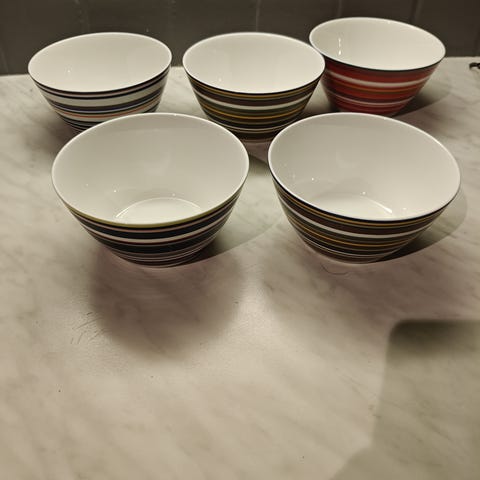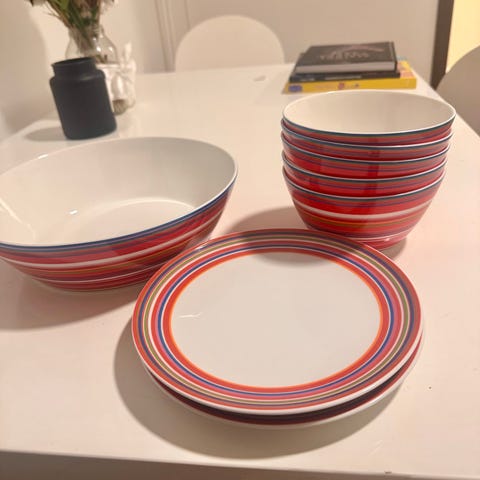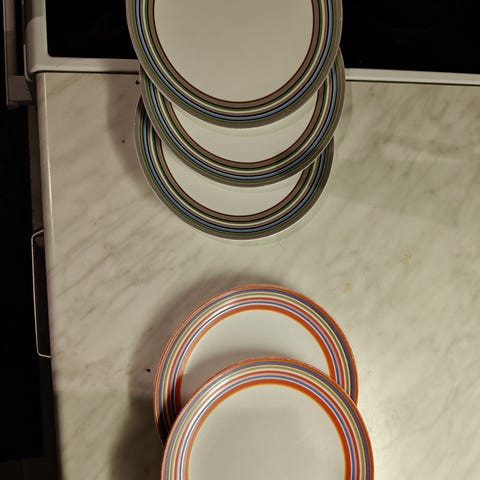 Iittala Origo- sarjan lautaset, jossa valkoinen pohja ja värikkäät raidat reunassa. Kuvissa useampi samanlainen lautanen samasta sarjasta.