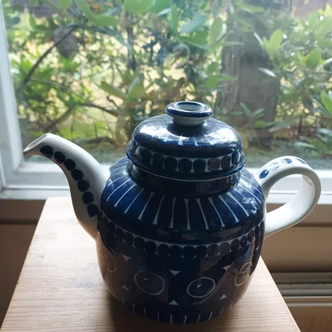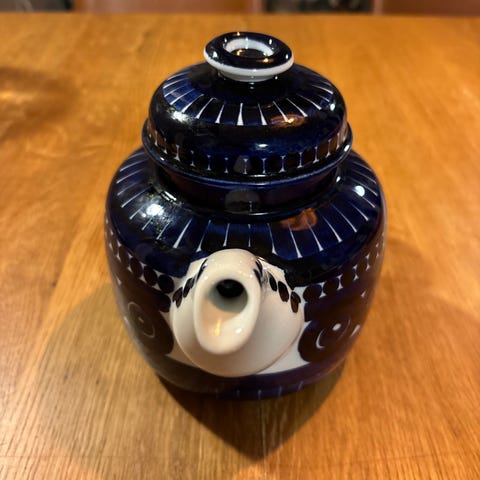 Arabia Valencia teekannu. Nokassa 2x3mm kokoinen lohkeama joka näkyy yhdessä kuvassa, muuten täysin ehjä. Korkeus 19 cm.