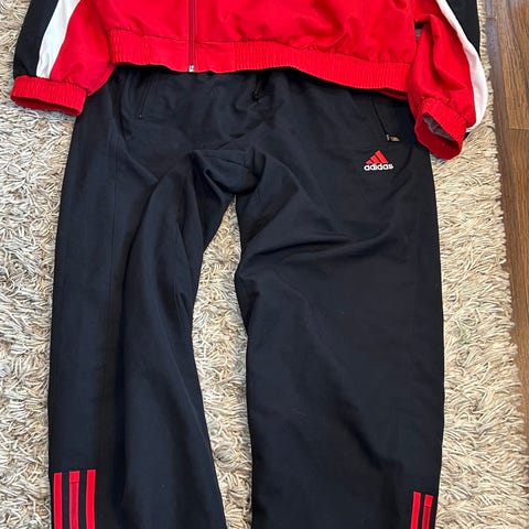 Adidas miesten tuulipuku, koko XL. Takki on pääväriltään vaaleansininen, jossa tummansiniset sivupaneelit ja punaiset yksityiskohdat olkapäillä ja kauluksessa. Edessä täyspitkä vetoketju ja sivuilla vetoketjulliset taskut. Kevyt, verkkovuorinen malli, joka sopii esimerkiksi vapaa-aikaan ja erilaisiin urheilulajeihin. Kangas on kevyttä ja pehmeää. Housut tummansiniset ja toisessa lahkeessa pieni reikä, joka näkyy kuvassa, mutta muutoin kunto hyvä.
