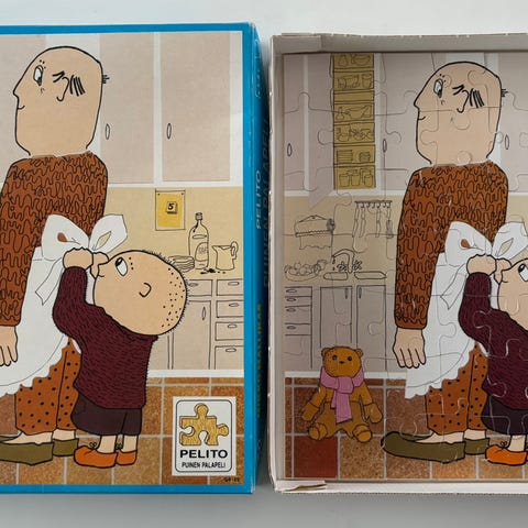 Mikko Mallikas puupalapeli. Palikoista muodostuu 6 erilaista kuvaa. Kaikki osat ehjiä, mutta käytettyjä. Laatikko ehjä, joskin kulmista vähän kulunut. Yleisilme siisti vaikka tällä on jo leikitty.