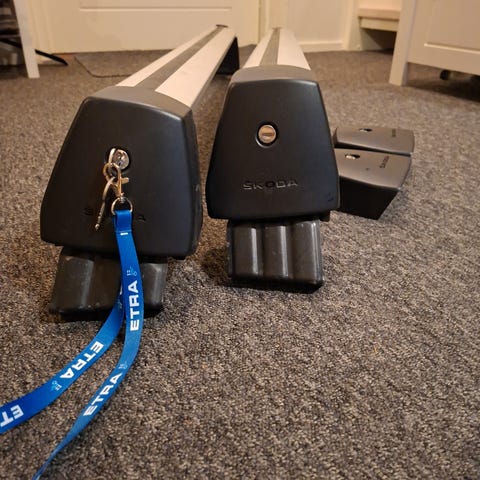 Skoda kattotelineet. Telineissä alumiiniset poikkiputket ja muoviset jalkapalat. Sopivat auton kattokaiteisiin tai kiinnityspisteisiin mallikohtaisen sovituksen mukaan.