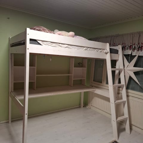 Siisti ja ehjä parvisänky pöydällä, laatikoilla, hyllyillä ja kaapilla. Hyväkuntoinen, ainoat moitteet tarrojen poiston vuoksi maali hieman lähtenyt sängyn yläosasta yhdestä kohtaa ja pöytälevyn reunassa joitain jälkiä. Sängyn koko 90cmx200cm. Patja ei sisälly kauppaan.
