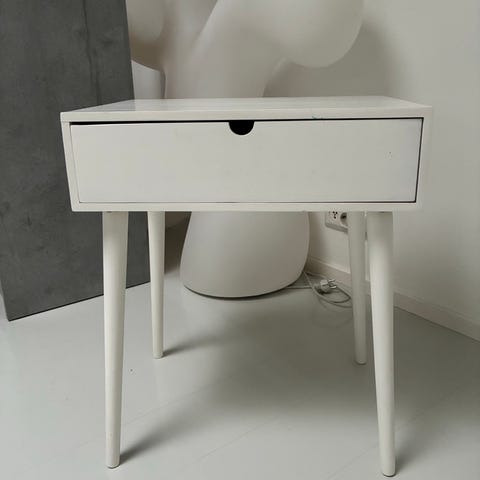 Myynnissä valkoinen Eket-merkkinen yöpöytä Ikealta. Muutamia jälkiä, jotka eivät lähteet kostealla liinalla pois.