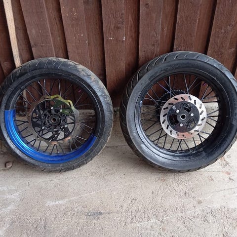 Nyt ois oikein kiiltävät ja tyylikkäät smoto vanteet kaupan. etu pyörä on oikein hyvä kumia on vielä jäljellä ja jarru levy tulee mukaan. Taka pyörässä nastakumi ilman nastoja. Hyvä kumi vaikka poltettavaksi. Takarenkaaseen tulee jarrulevy mutta ei ratasta. Mukaan ei tule akseleita tai laakereita. Rohekasti yhteyden ottoa jos kiinnostus heräsi. Haku Riihimäki