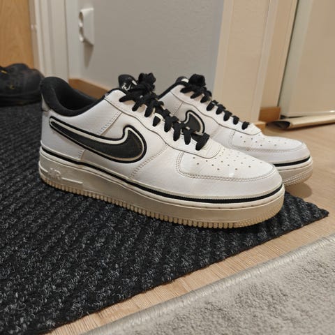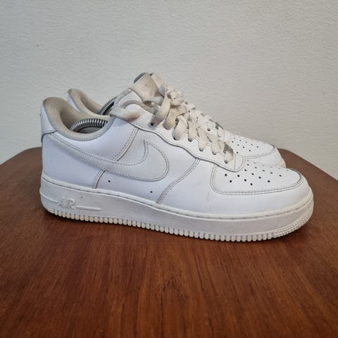 Nike Air Force 1 tennarit, koko 43. Väri valkoinen. Klassinen matalavartinen malli, nahkamainen päällinen ja kumipohja. Nauhakiinnitys. Sopivat arkikäyttöön ja vapaa-aikaan.