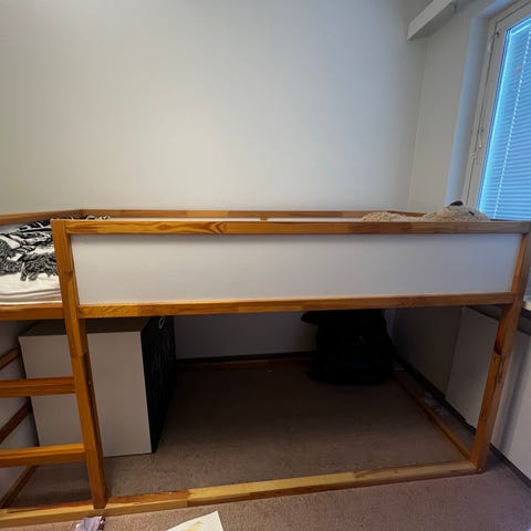 Korkeus 107cm korkeimmalta kohdalta, syvyys 87cm. Sänkyyn menee 80x200cm patja. Käytön jälkeä ja jotain piirtelyn jälkiä on, puhdistelu jää hakijalle. Puran valmiiksi jos hakija haluaa.