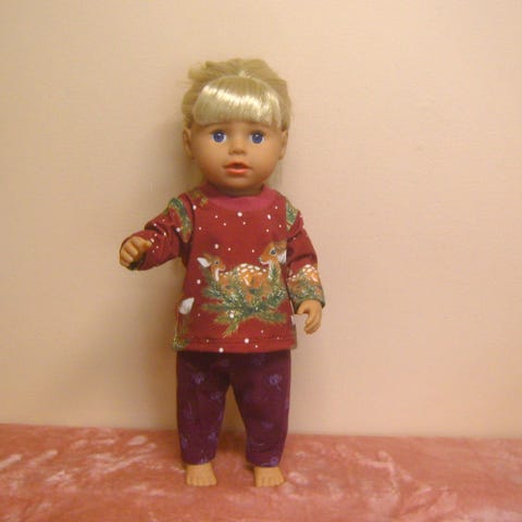 43 cm nukelle (baby born tai sister) trikoosta kuviollinen paita, jossa takana pukemista helpottava tarrakiinnitys. Housuissa vyötäröllä kuminauha.