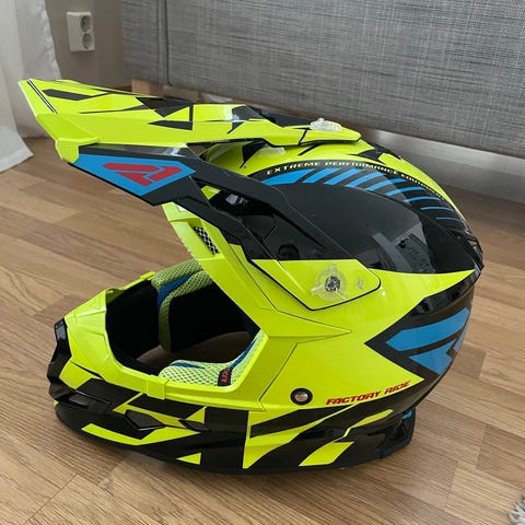 XXS kokoinen (52/53) offroad-kypärä, väriltään sininen, musta ja harmaa graafisilla kuvioilla. Kypärässä on pitkä lippa, täysi leukasuoja sekä useita ilmanvaihtoaukkoja. Sisävuori on pehmustettu ja hengittävä, ja se näyttää olevan irrotettava pesua varten. Sopii esimerkiksi kelkkailu, motocross- tai endurokäyttöön sekä muuhun maastoajoon, jossa käytetään erillisiä ajolaseja.