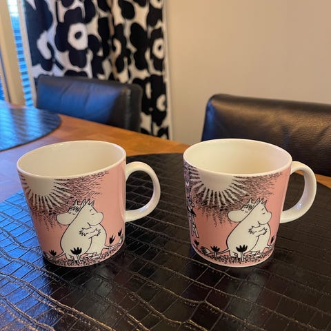 Myydään yhdessä settinä 2kpl muumimukeja, Muumipeikko turkoosi, ja Tiuhti ja Viuhti muumimuki. Molemmat siisti ei moitteita ja kruunuleima.