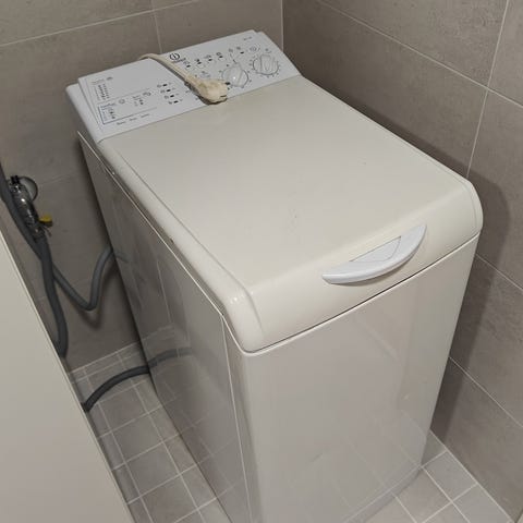 Indesit -merkkinen, edestä täytettävä pesukone. Ollut käytössä alle 5 vuotta. Väri valkoinen, etupaneelissa ohjelmavalitsin, digitaalinen näyttö ja useita pesuohjelmia. Laitteessa on etuluukku, johon pyykit asetetaan rummun kautta. Mukana tulevat vesiletku ja virtajohto. Muuton yhteydessä nukkasihtimen paneeli hieman haljennut.