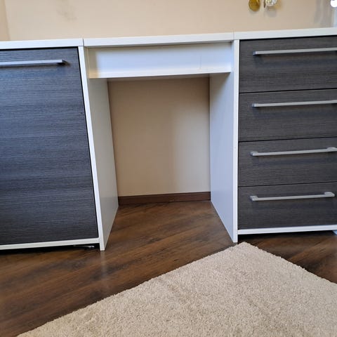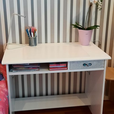 KOTITOIMISTO/KOULUPÖYTÄ, valkoinen laminaattia. Oikealla tilava laatikko ja kaappi, jossa hylly.