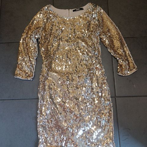 Bik Bok juhla- tai cocktailmekko naisille. Koko L. Mekko on kauttaaltaan kullanvärisillä paljeteilla koristeltu. Mallissa on 3/4-pituiset hihat ja avoin selkäosa. Sivulla vetoketju pukemisen helpottamiseksi. Sopii juhla- ja iltakäyttöön.