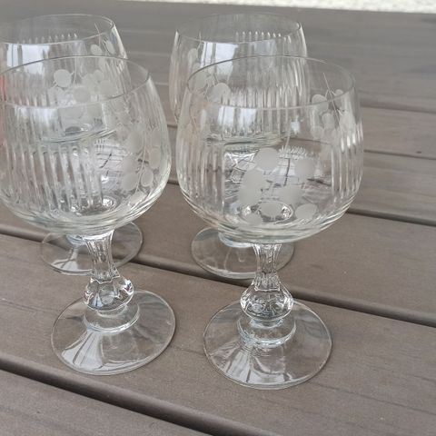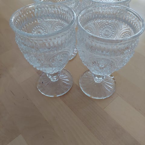 Viisi kirkasta viinilasia, joissa on koristeellinen ”pallo”jalka.Lasit edustavat klassista muotoilua, joka on ajaton ja sopii monenlaisiin kattauksiin.Lasit ovat hyvässä kunnossa ilman näkyviä vaurioita.