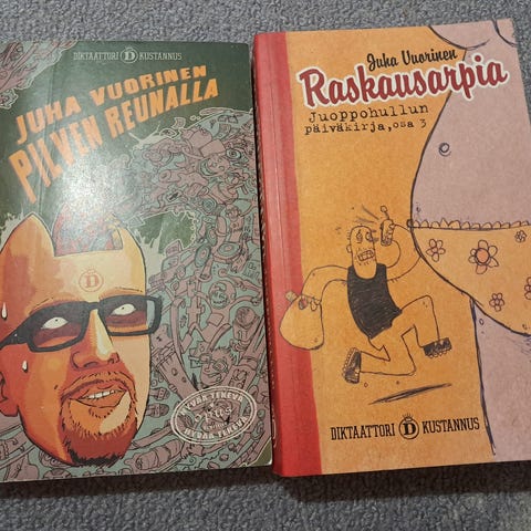 Juha vuorisen kirjat Juoppohullun päiväkirja ja Raskausarpia. Toinen kovakantinen ja toinen pokkari.