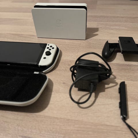 Nintendo Switch OLED -pelikonsoli valkoisilla Joy-Con-ohjaimilla. Pakettiin kuuluu telakka, virtalähde, HDMI-kaapeli ja rannekkeet Joy-Con-ohjaimille. Mukana on lisäksi erillinen langaton peliohjain. Mukaan tulee kolme Nintendo Switch -peliä koteloineen. Konsoli soveltuu käsikonsolikäyttöön, pöytätilaan sekä televisioon liitettynä telakan kautta. OLED-näyttö tarjoaa tarkan ja kirkkaan kuvan käsikonsolitilassa. Ostopäivä ja takuutiedot näkyvät takuukuitissa kuvassa.