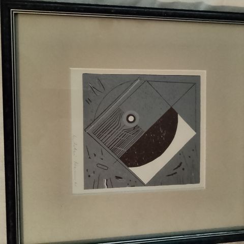 Kehystetty taiteilija Erkki Hervon grafiikkateos vuodelta 1984, jossa abstrakti kolmesta vinosta muodosta koostuva kuvio.