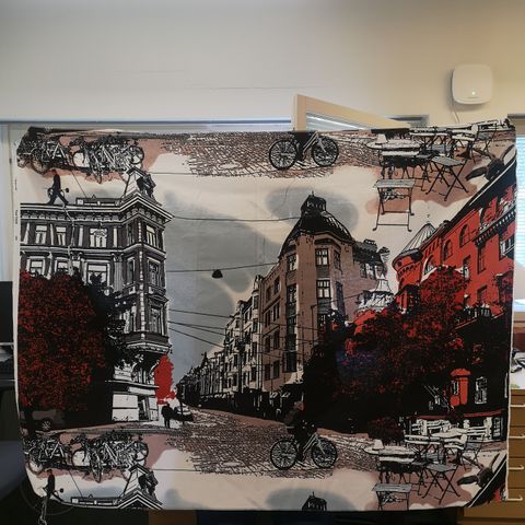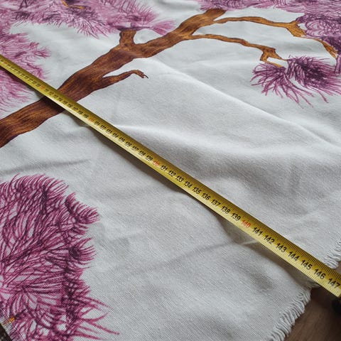 Kangaspalan koko on 84 x 200 cm, ja kuva-aiheen koko on 84 x 150 cm. Ohut kangas on puuvillaa.