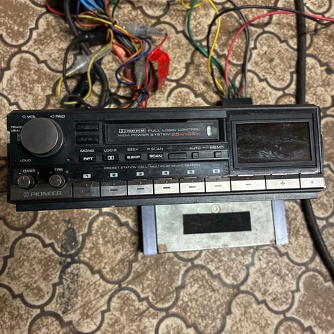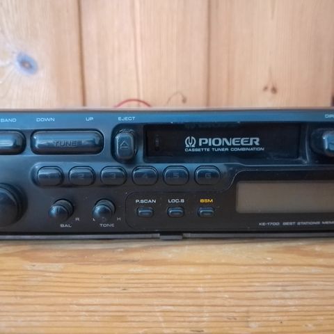 Pioneer autosoitin kasettisoittimella. Laitteessa on kasettipesä ja perinteiset painikkeet toiminnoille, kuten äänenvoimakkuuden ja kanavien säätö. Takapuolella virtajohdot ja liitännät auton sähköjärjestelmään sekä antenniliitäntä. Sopii ajoneuvoon, johon halutaan perinteinen kasettisoitin-autostereo.