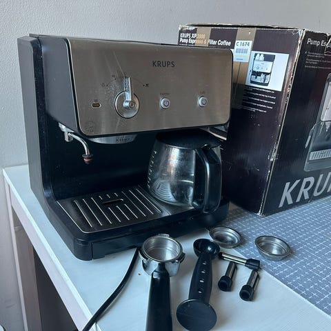 Krups espressokone kotikäyttöön. Laitteessa on painekahva suodatinsihdillä, tippakaukalo ritilällä sekä höyrysuutin maidon vaahdottamiseen. Rungossa on teräksen ja mustan muovin yhdistelmä. Sopii espresson ja muiden kahvijuomien valmistukseen jauhetusta kahvista. Käyttöpainikkeet sijaitsevat laitteen etuosassa ja sivussa on säätönuppi höyrylle. Kompakti koko keittiön työtasolle.