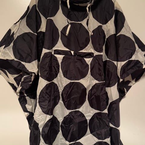 Marimekon tyylikäs ja lämmin mustavalkoinen viitta / poncho, jossa on puolivetoketju edessä, korkea ribbineulottu kaulus sekä kätevät aukot käsille. Design Ritva Falla.
