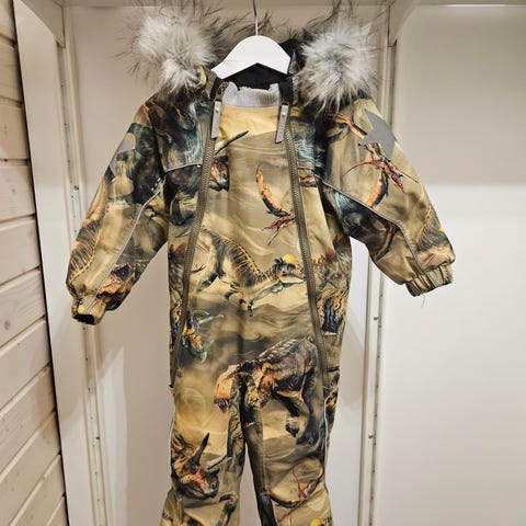 Ihana Molo haalari lapsille, koko 92. Unisex-malli. Haalarissa on kirjava, dinosaurusteemainen kuosi. Edessä on vetoketju, hupussa tekoturkisreunus ja hihansuissa sekä lahkeensuissa kuminauharesorit. Lahkeissa on jalkalenkit. Vuori on pehmeää materiaalia. Hyvät ominaisuudet, käytetty toki - edelleen pitää vettä ja on lämmin. Polvissa ja pepussa hieman pehmeyttä, heijastimissa lievää kulumaa. Myyntiä varten kerran juuri pesty.