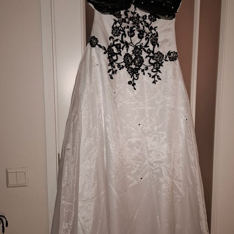 Mekko on ollut kerran yllä. Yläosa on vihertävä ja helma tummakulta, tylli alushame sekä tummakulta vuori, päällä ohut läpinäkyvä kangas. Vaikka vanhojen tanssiin/hääpuvuksi.