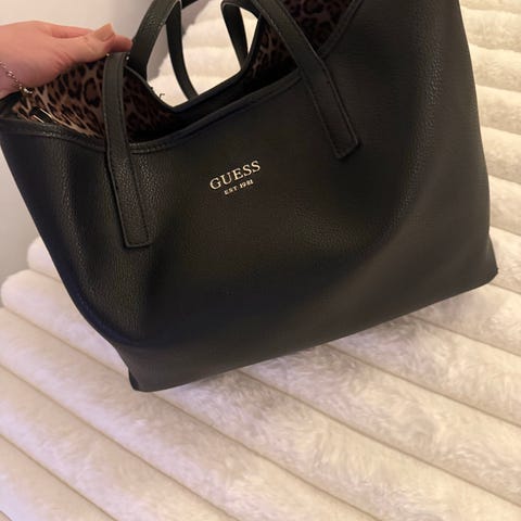 Guess olkalaukku naisille, valmistettu tekonahkasta. Laukussa on kaksivärinen pinta, jossa logokuvioitu osa ja ruskeat reunat. Metallinen ketjuhihna mahdollistaa laukun kantamisen olalla. Sisäpuolella on useita lokeroita ja taskuja pienten tavaroiden, kuten puhelimen, lompakon ja avainten säilyttämiseen. Sopii arki- ja juhlakäyttöön. Laukkua on käytetty muutaman kerran!