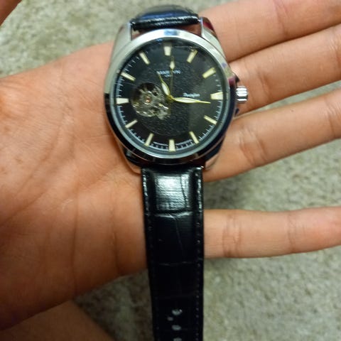 Kellotaulu osittain avonainen ja koneiston liike näkyy viisarien taustalla. Täysin automaattinen koneisto, eli ei paristoa.