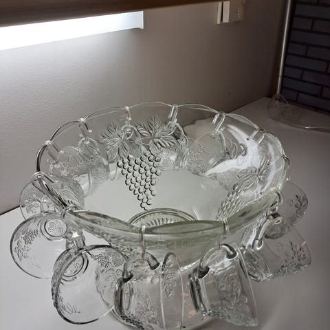 Viinirypäleterttu kuvioitu boolimalja ja 12 kpl kuppeja. Ehjät ovat.